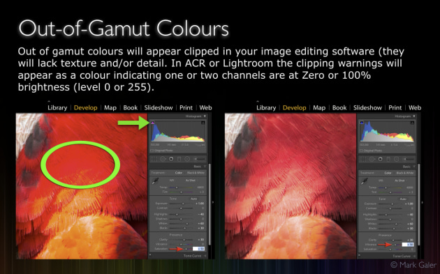 The illustration above shows how colours can become fast if the colours exceed the gamut of the monitor. Colours with that appear to have no gamut warning will still appear ‘out of gamut' in the preview when working on a monitor with a small colour space due to the fact that the ‘working space’ of Lightroom is very very large. This example is take from an eBook available here: http://www.markgaler.com/product/colour-management-ebook