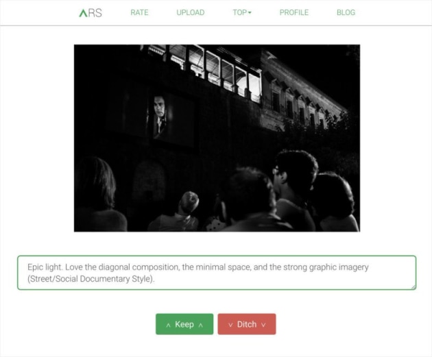 ARS has a basic feedback process. Photographers can “keep” or “ditch” each photo while providing optional comments. Users who aren't registered on the platform are unable to see, comment or upload images. Photographers can view their "Keep" percentage for each uploaded image, as well as the number of critiques provided.