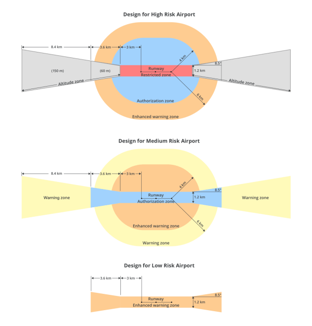 The DJI GEO 2.0 system applies detailed, risk-based airspace principles to the airspace around airports that can be considered to involve relative high, medium and low risk.