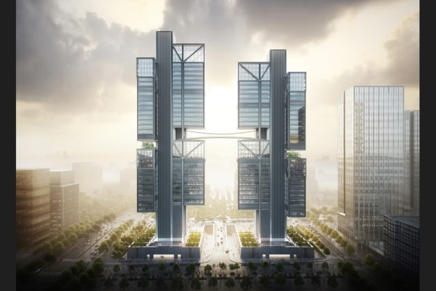 The enormous new twin tower project will feature huge indoor drone flight testing spaces as well as a skybridge connecting the towers, which can be used for showcasing drones and technologies.