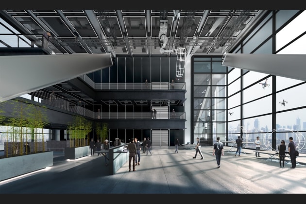 “The floors are arranged in floating volumes cantilevered from central cores by large steel megatrusses – creating large, column-free spaces throughout, with unique quadruple-height drone flight testing labs,” says the architectural firm.
