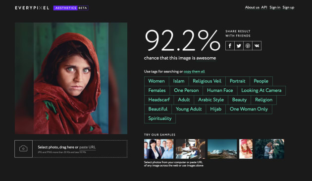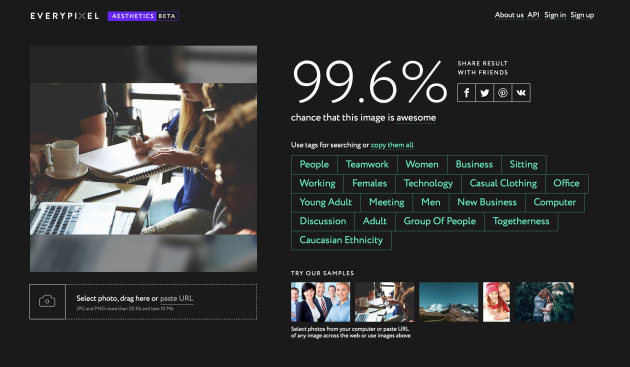The stock photography search engine Everypixel has launched a new web app called Everypixel Aesthetics that uses a neural network to tell you how awesome any photo is.
