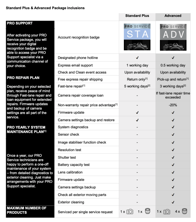 The Olympus PRO Service programme features two packages, 'Standard Plus' and 'Advanced', and offer benefits in priority customer support, repairs with loan equipment and regular system maintenance for Olympus shooters.