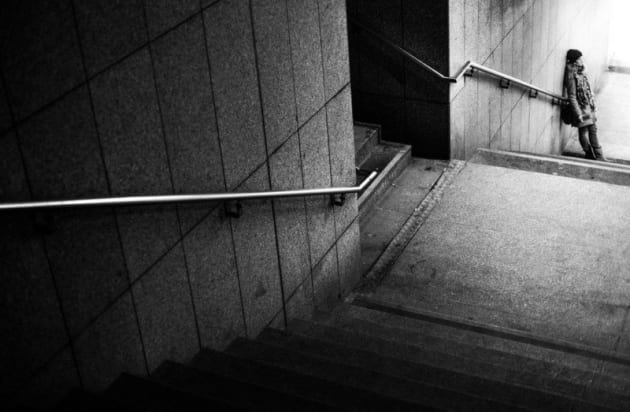 For this street photo, I used the backlight from the subway hallway to highlight the subject. Besides, the handrails serve as a leading line. I darkened the left part a bit in post-processing to make it transition from dark to bright.
