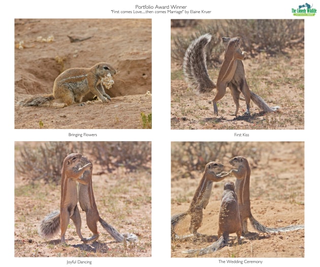 Other category winners included Vlado Pirsa’s strikingly colourful shot of some birds in Croatia which won the Photo Creatures of the Air Award and Elaine Kruer was awarded the Portfolio Award for “First Comes Love” a series of 4 images depicting Cape Squirrels in South Africa.