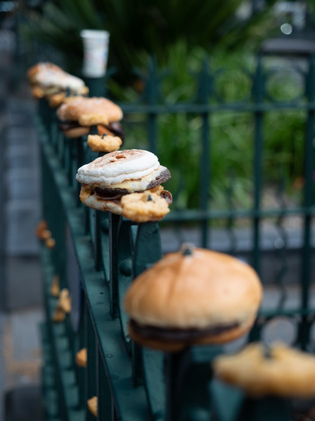 A typical street rambling photo session saw me wandering close to Vic Market, Melbourne. Someone got creative with the burgers and stabbed them onto the points of the wrought iron fence. I shot it with a wide aperture to reduce distractions and concentrate on the quirky and repetitive nature of the scene.