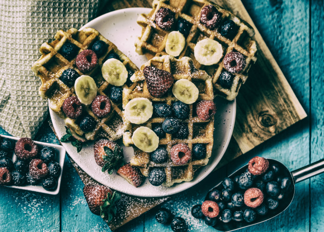 I wanted to showcase the contrast in shapes between the squares (waffles, small bowl, cutting board and tea towel) and the large round plate and mainly round fruit. Placing the square elements at different angles created a more dynamic image.