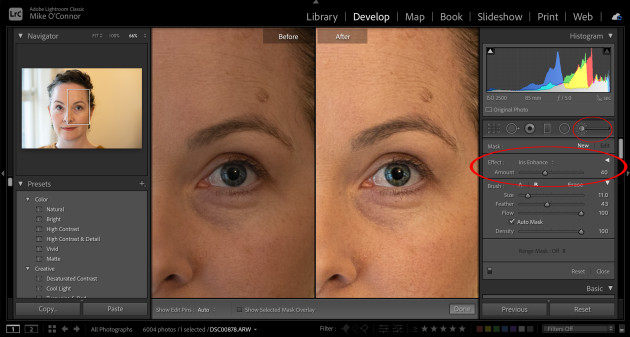 The presets are simply default values that Lightroom thinks would work well to accomplish specific tasks, so as well as familiar settings like Dodge and Burn (for localised adjustment to exposure) there’s also a few handy ones for editing portraits such as Teeth Whitening and Iris Enhance. With all of the presets, you’re free to override the setting sliders to make the chosen effect as dramatic as you like. Here’s a quick tip – you can reset any slider back to 0 by double clicking the ‘Effect’ label.