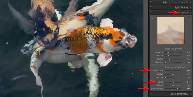 This image was captured at an ISO of 1250, which has introduced a fair amount of noise into the image. To reduce it, go to the Detail panel and raise the Luminance and Color sliders to +50 and the Smoothness slider to +80. These settings should help to smooth the water without reducing too much detail from the fish.
