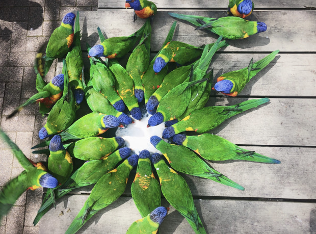 I love the way the lorikeets arranged themselves around the bowl of food and had to take a snap!
