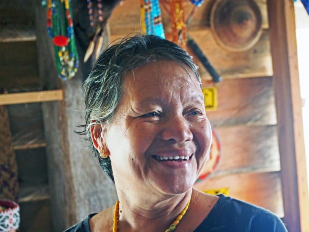This is the lovely owner of a homestay in a small village outside of Bario, Sarawak Malaysia, standing in front of the jewellery she teaches people to make.