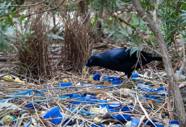 Male Satin bowerbirds build specialised stick structures, called bowers, which they decorate with blue objects. Those blue objects are sometimes natural objects such as feathers, flowers, seed-pods and fruits, but more often now artificial items, mostly plastic. Females visit these and choose which male they will allow to mate with them. Photographed on the University of Wollongong campus, New South Wales, Australia.