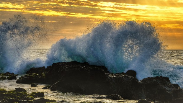 Beautiful wave splash with a sunrise backdrop.