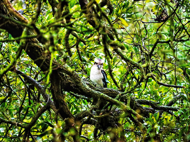 Kookaburra perched in a tangle of jungle vines.