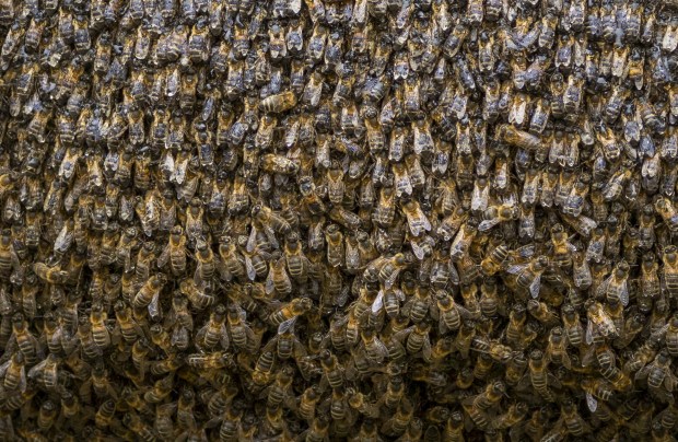 A wild swarm of honey bees in the bush.