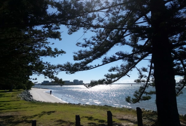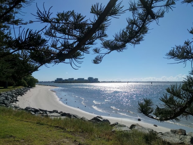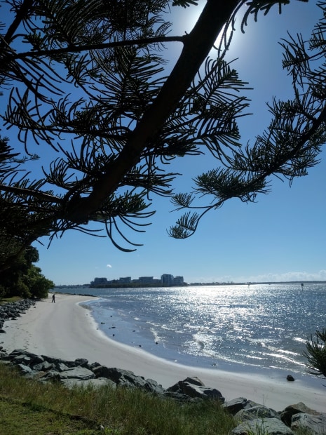 A delightful walk may be enjoyed along this foreshore, beneath the pines at Hollywell on the Gold Coast. With the sunlight glittering off the water, these pictures portray a beautiful landscape for a relaxing Sunday morning stroll.