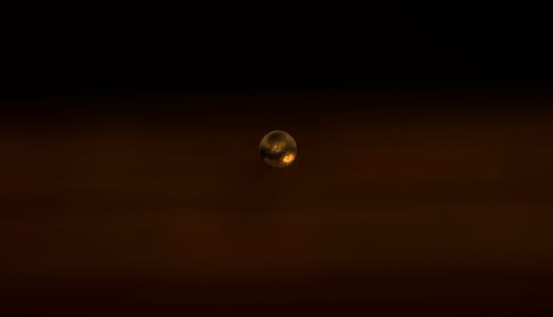 pin pressed into deck with full moon reflecting on pin head making it look like planet mars taken from above using tripod & macro lens