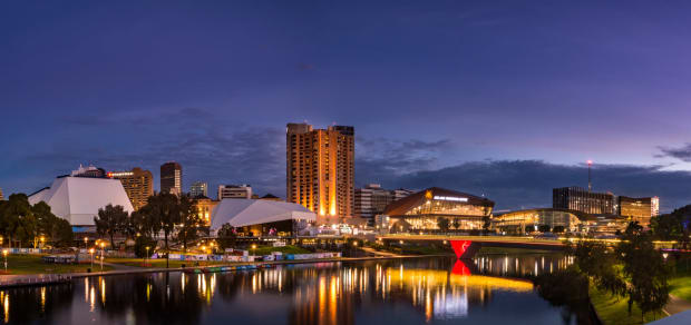 The city of Adelaide over the River Torrens, after sunset.