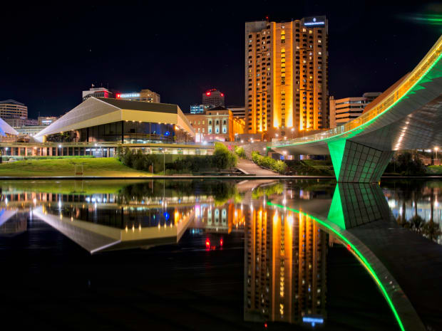 The city of Adelaide pictured at night across the Torrens Lake next to the footbridge.