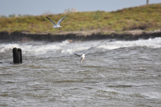 A picture of 2 seagulls trying to get food during a windy day in Melbourne