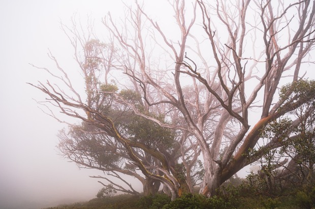 Gnarly shapes of the Snowgums, with a backdrop of heavy fog the twisted branches display some life amongst the dead branches