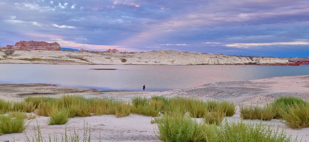 A lone person enjoys the solitude as the sun sets over Lake Powell