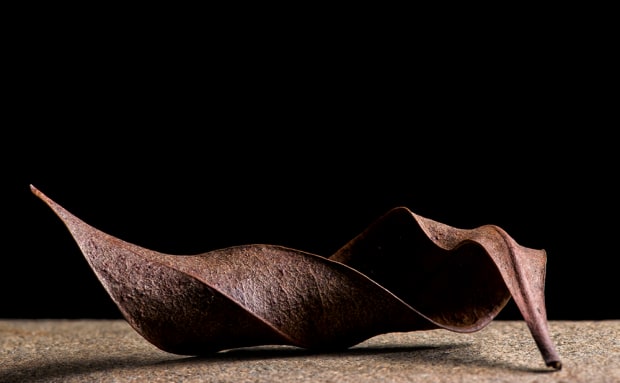 Using light and shadow to highlight the beautiful curves and texture of a dried leaf, showing how beauty continues to evolve, even after death