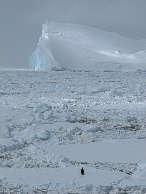 A lone emperor penguin stands on the sea ice, staring into the distance at the vast iceberg standing as a mountain on the horizon.