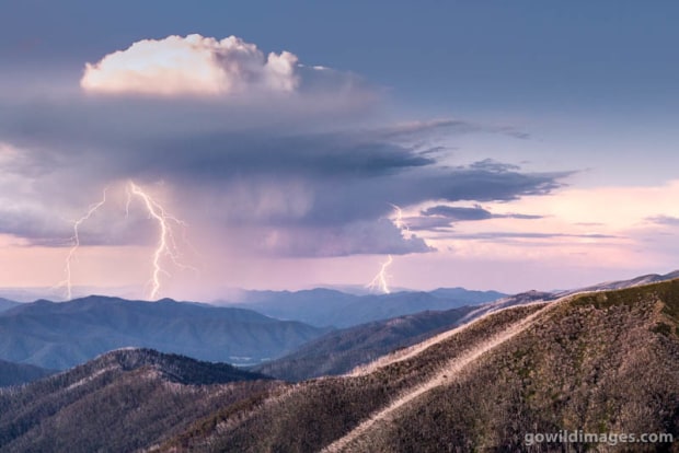 A Summer storm rolls over the Victorian High Country near Mt Feathertop, illuminating the last hours of Christmas Eve. Two images combined, taken 2 minutes apart, as lightning was infrequent.