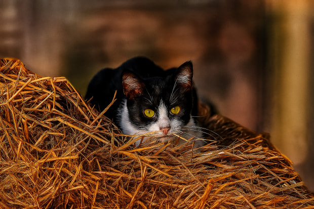 A resilient black-and-white cat finds solace on a sun-bleached pile of hay, embodying tranquility amidst the dry landscape of drought season