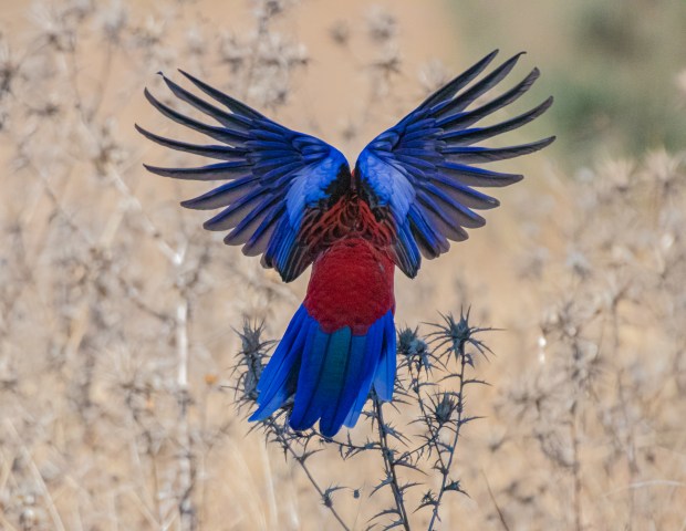 A Crimson Rosella carefully navigates themselves amongst the prickly thorns