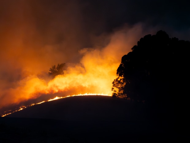 An arc of flame runs along a ridge line during the disastrous Longwood fire this month. OM-D EM1 Mklll, OM Zuiko 12-200mm, ISO6400, f8, 1/50 sec