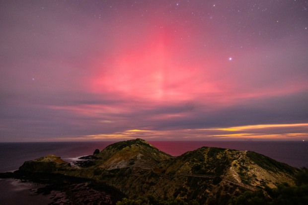 A rare burst of the Aurora Australis dances above Victoria’s rugged coastline, painting the night in surreal shades of crimson and violet. Nature’s own theatre under the southern stars.