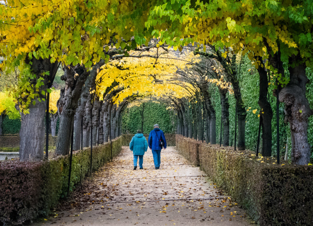 Older couple walking through an avenue of autumn leaves, in the garden of Wurzburg Palace. Shot with SonyRX10mk4.