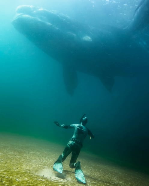 My dive buddy was brought to his knees quite literally when we encountered this huge Southern Right Whale and calf in Skeleton Bay, Tasmania.