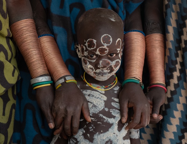 Babaku, of the Suri Tribe with his mother and aunts, in the Omo Valley, Ethiopia.