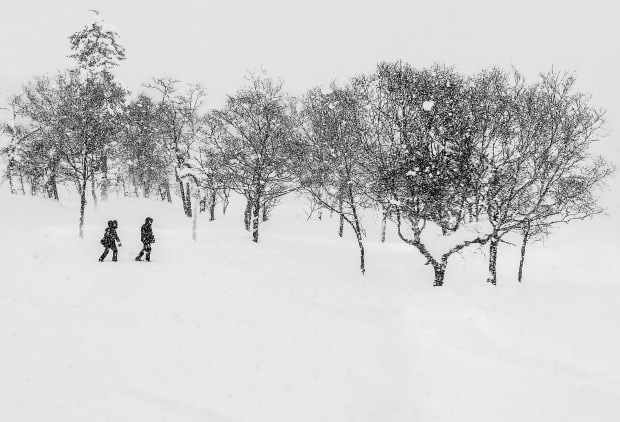 Two lone figures transverse a snowy landscape as a storm hits in Hokkaido Japan