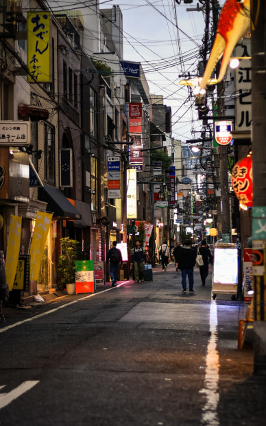 I was drawn to the moody light and how the glowing signs, tangled wires, and curved lines of the street all came together in this moment.