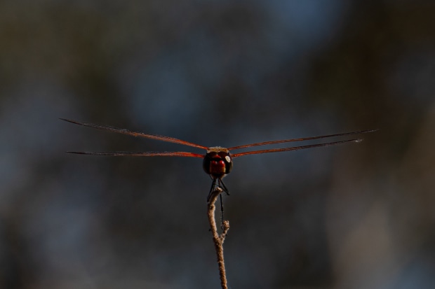 Hanging perfectly still, a red Dragonfly is resting in the midday sun