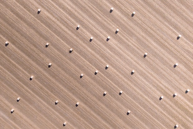 Bird’s-eye view of wrapped hay bales shows them scattered across a stubbled paddock, forming a loose trail through the frame.