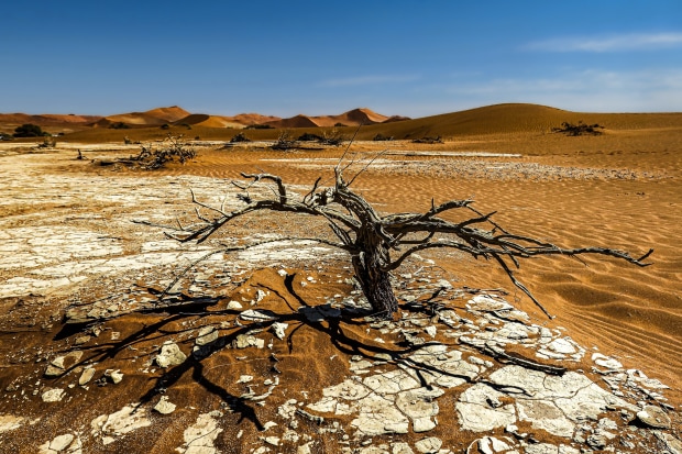 Cracked earth and sand surround the dead tree, branches bleached by the sun and casting a skeletal shadow on the ground. Dunes flow across the horizon, the dry earth the essence of this desert landscape. Location: Sossusvlei, Namibia.