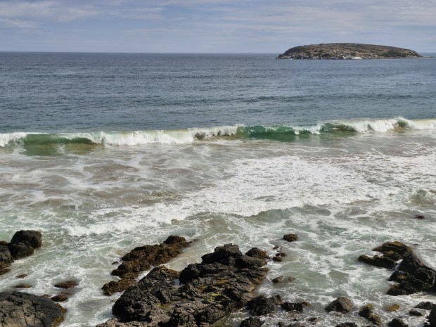 Giant waves coming in and smashing into the black rocks. An island can be seen in the distance.