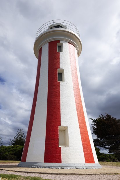 An image of Mersey Bluff Lighthouse, Tasmania taken from a low-angle, creating an imposing effect on the viewer.