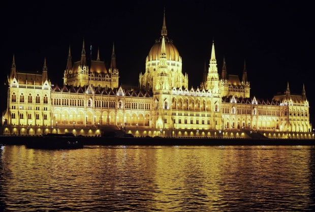 Taken from the river , on a beautiful evening in Budapest. Their Parliament building glows with beauty