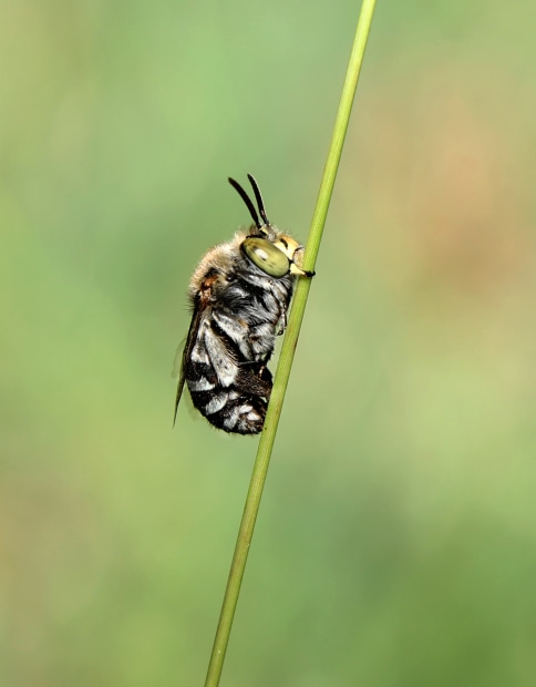This is a male native Blue Banded bee. They are solitary bees and in the evening they find a place to settle for the night by clinging to grass, leaves, sticks etc by tucking their legs in to their body and hanging on by their jaw. This one decided to settle for the night on a stalk of grass in my back yard.