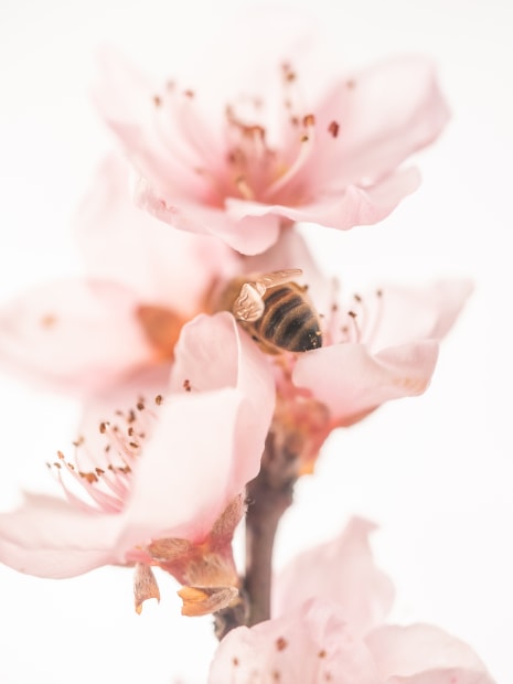 In the spring time I love to see honey bees buzzing from flower to flower and for me they just seems so happy, so I had to capture that heavenly feeling these little bees must feel when they see all those fresh flowers blooming. I purpously over exposed the sky to make it look light, fluffy and soft.