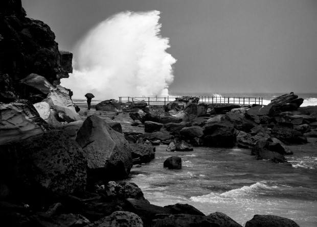 North Curl Curl beach during a storm. A man with an umbrella stood in the impact zone of a giant wave. This was taken just before it crashed over him.