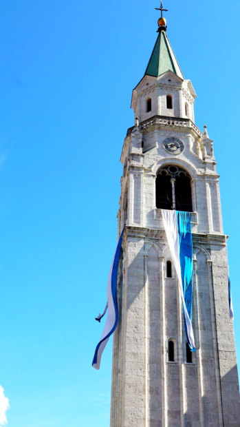 Flags billow in the wind, giving the illusion that the bell tower is about to take flight - Cotina D'Ampezzo, Dolomites, Italy