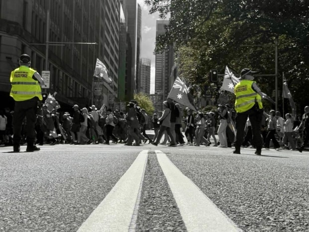 From ground level, the road leads straight into the heart of a moving crowd. High‑vis yellow cuts through grey, marking the fragile balance of order and protest. A single frame of democracy in motion—tense, loud, and alive.