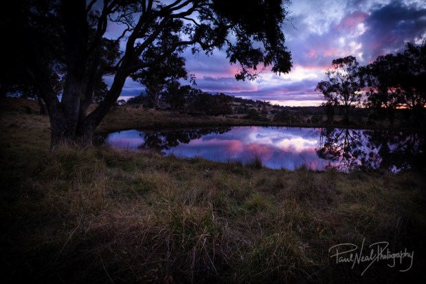 The sunset sky was full of pinks and grey clouds and I was lucky enough to of been walking on a property and came across this billabong half way up a hill. The colours and reflection were to nice not to capture. Northern highlands of NSW